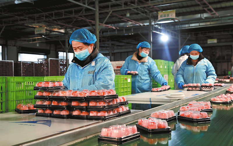 11月21日,富平县曹村镇华丽柿子专业合作社里,工人正在加工冰柿。